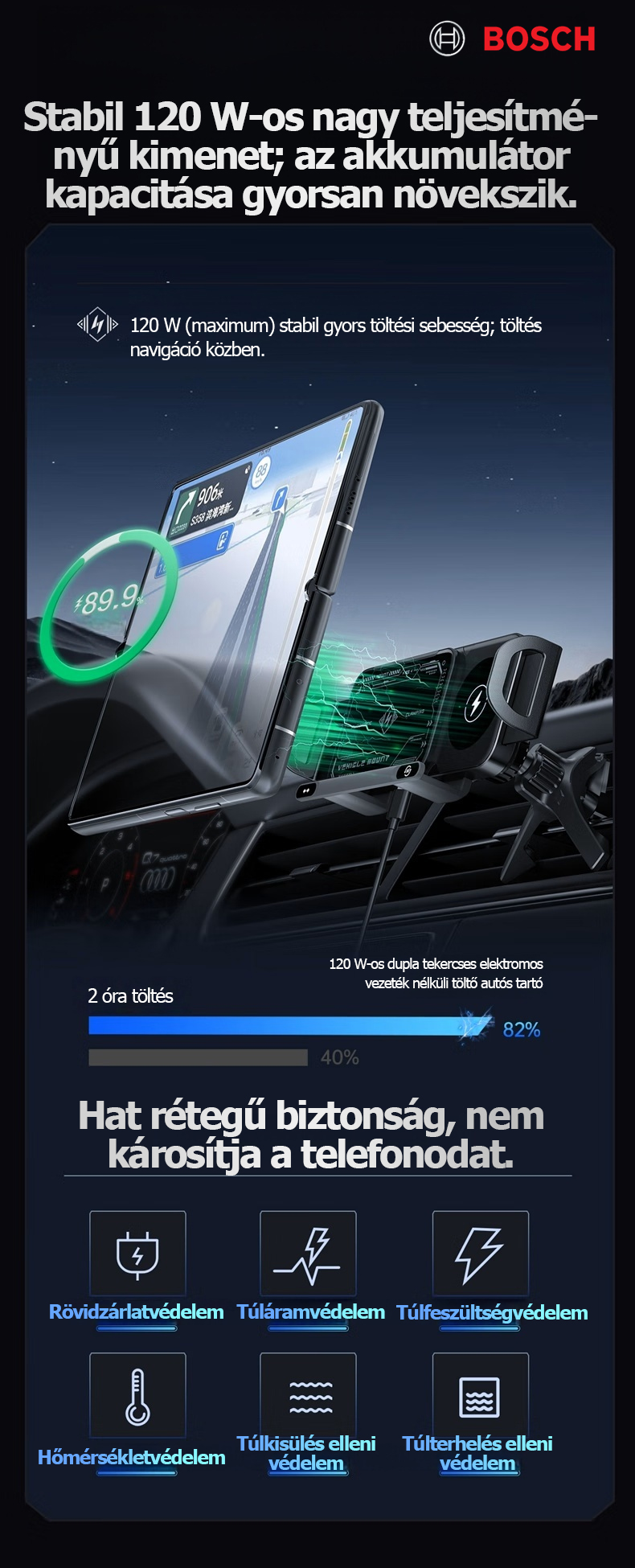 BOSCH autós tartó mesterséges intelligenciával támogatott hangvezérléssel, 3 az 1-ben automatikus forgatással, mesterséges intelligencia által vezérelt felismeréssel, vezeték nélküli WiFi-vel, gyors vezeték nélküli töltéssel és telefonokkal/összecsukhat