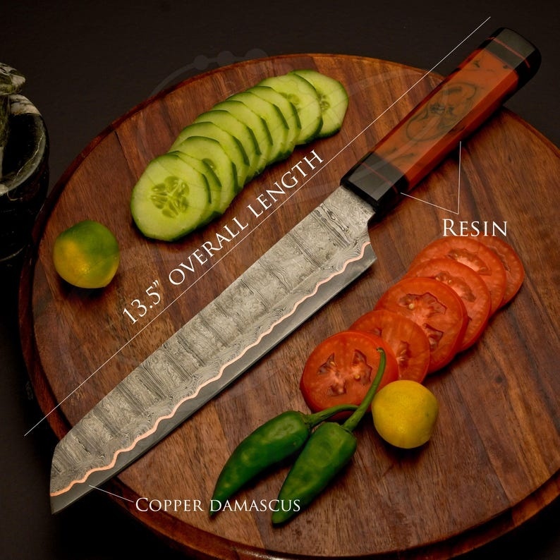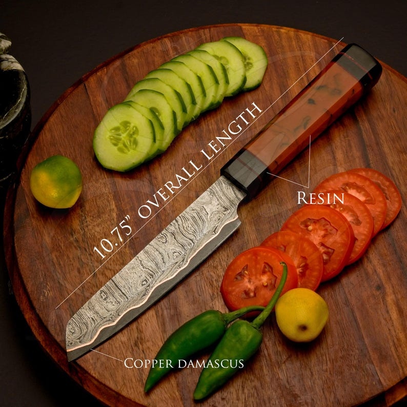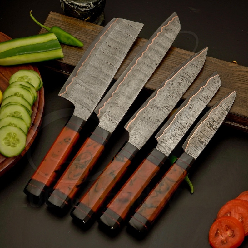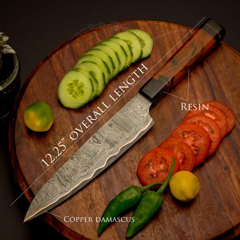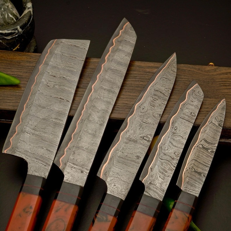 🔪 Kézzel kovácsolt réz–damaszkuszi konyhakés készlet · 5 részes