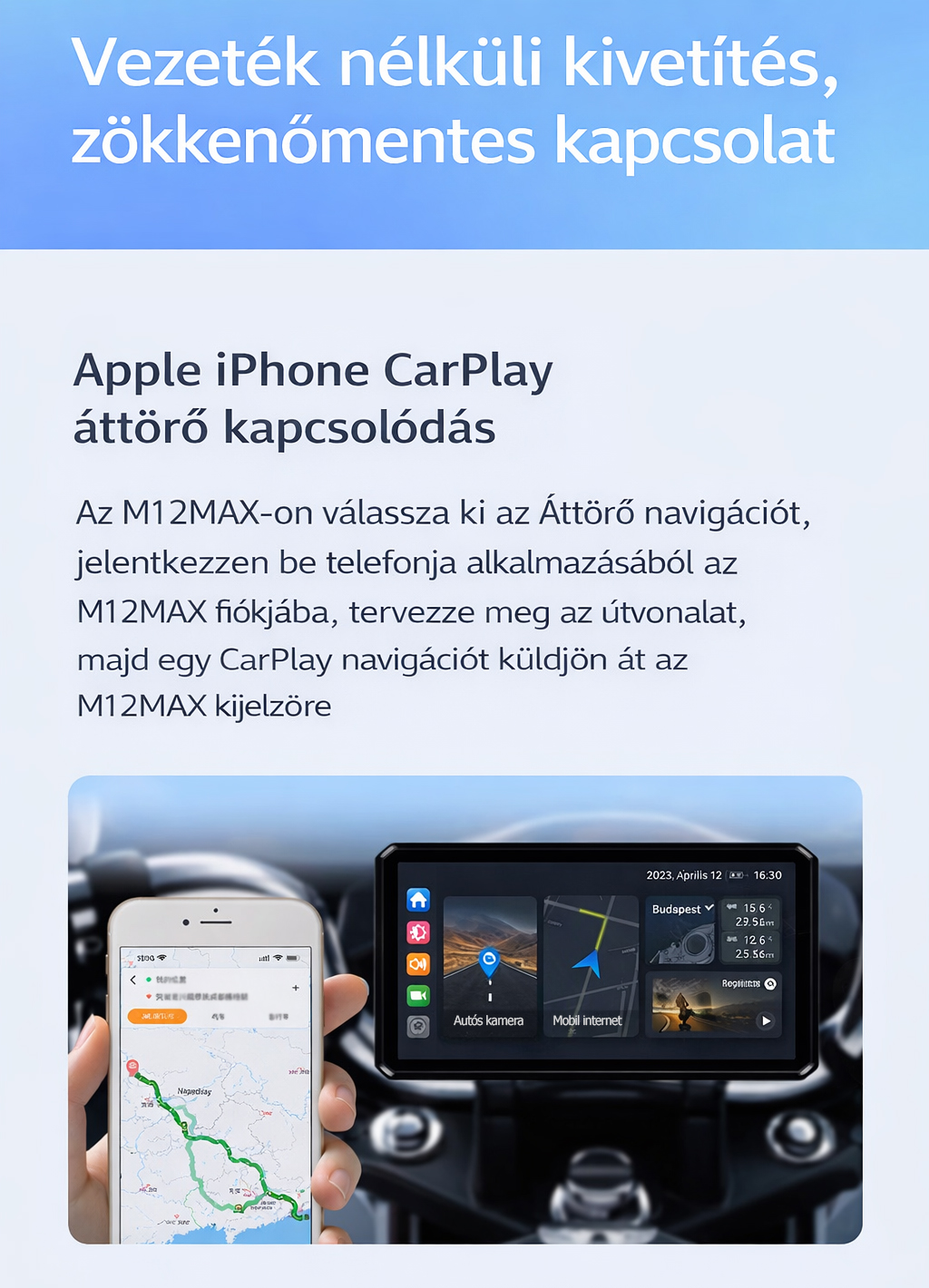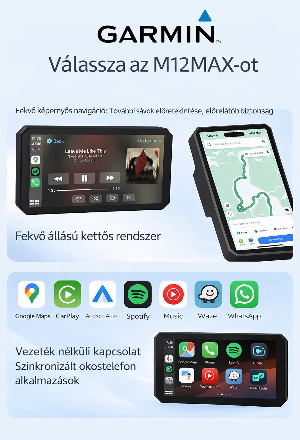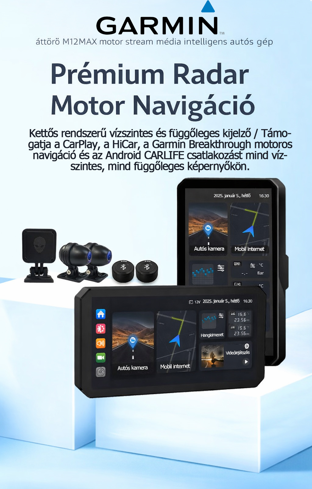 Garmin Breakthrough M12Max motoros fedélzeti kamera intelligens autós infotainment rendszerrel, CarPlay-jel, mobiltelefon-képernyő tükrözéssel, navigációval, milliméteres hullámú radarral, holttérfigyelővel és gumiabroncsnyomás-figyelővel