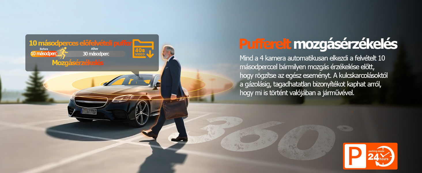 【Minden időjárási körülményre kiterjedő puffer parkolási mód】 Az N5S automatikusan aktiválja a parkolási módot, amikor leállítja a motort, rögzítve a gyanús mozgást vagy ütközéseket a parkoló jármű körül – így kulcsfontosságú bizonyítékot szolgáltatva a vandalizmus vagy betörés esetére a 360 fokos panorámafelvételnek köszönhetően, a nap 24 órájában. Egyedülálló, 10 másodperces előfelvételi puffer mozgásérzékelési funkciónk biztosítja a teljes eseményrögzítést. A gyorsindítású ütközésérzékelés biztosítja a bizonyítékok időben történő megőrzését.
