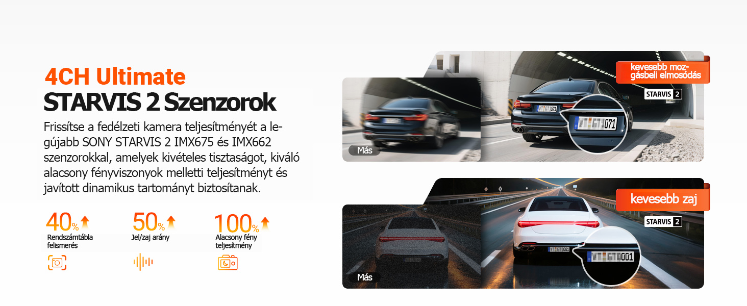 【Kiváló 4 csatornás STARVIS 2 éjjellátó】Mind a négy kamera a legmodernebb STARVIS 2 technológiát alkalmazza, amely 100%-kal jobb teljesítményt nyújt gyenge fényviszonyok mellett és 40%-kal jobb rendszámtábla-felismerést, mint más STARVIS autós kamerák. A fejlett HDR/WDR feldolgozási technológiának köszönhetően ez az autós kamera akár 32 km/h sebességig is pontosan képes rögzíteni a rendszámtáblákat, változó fényviszonyok mellett is, tükröződés nélkül! Mind az első, mind a hátsó kamera infravörös lámpákkal van felszerelve, így teljes sötétségben is tiszta képet ad a jármű belsejéről.