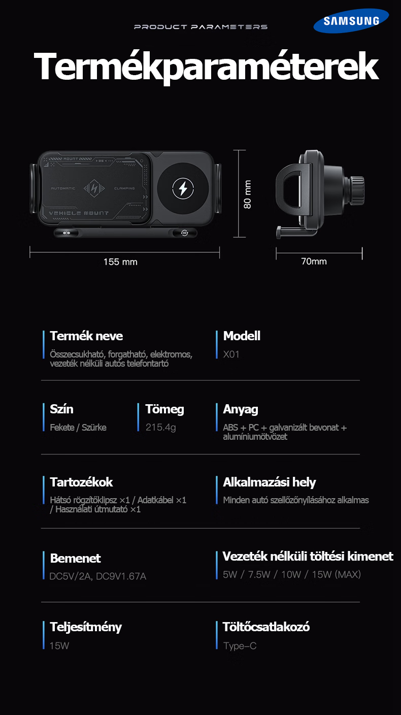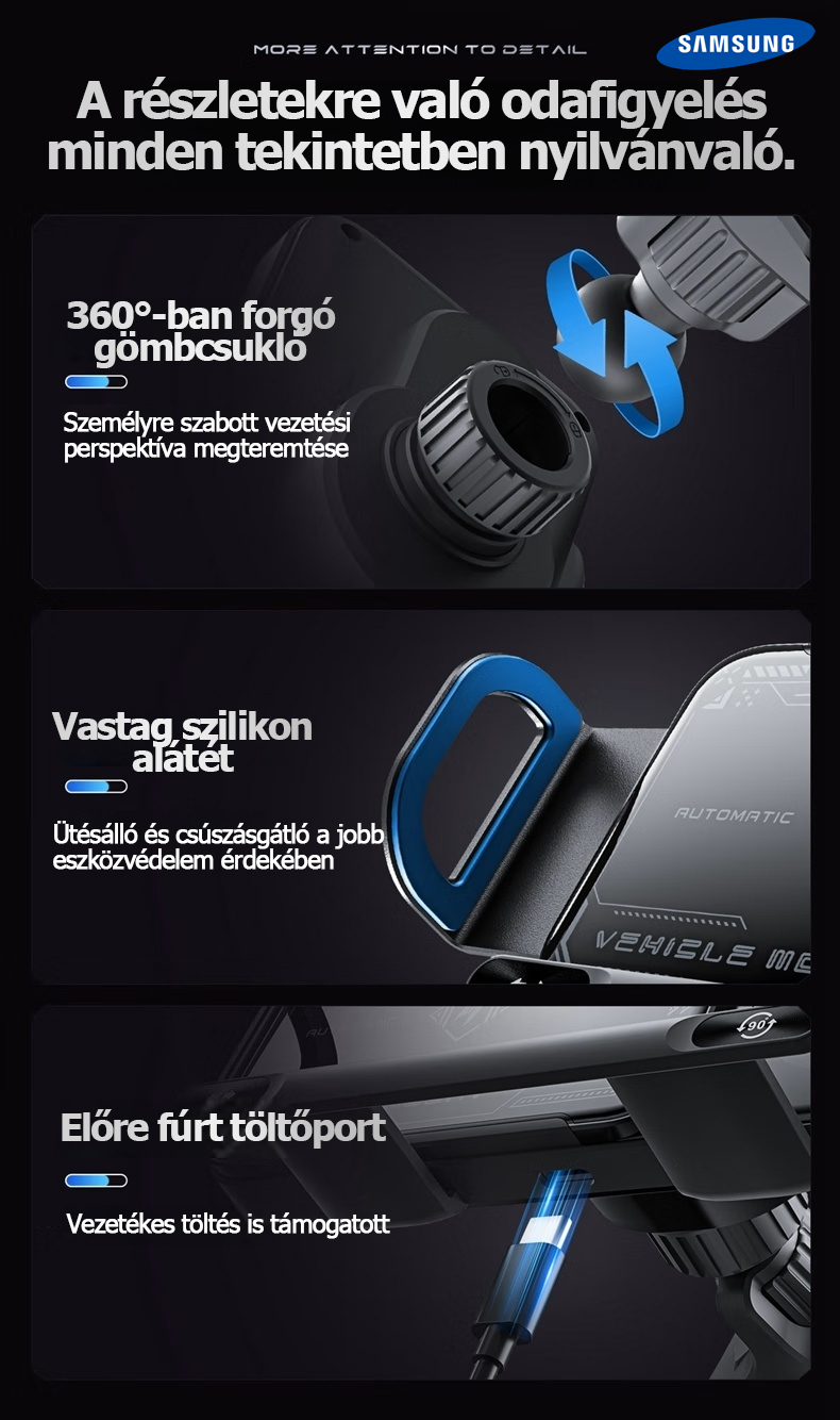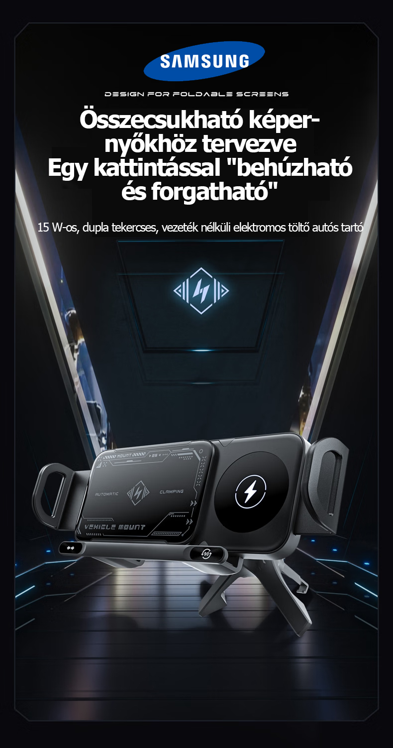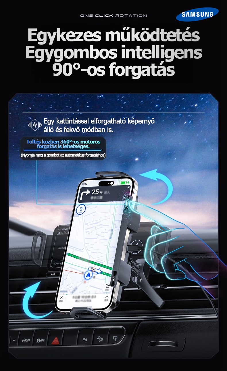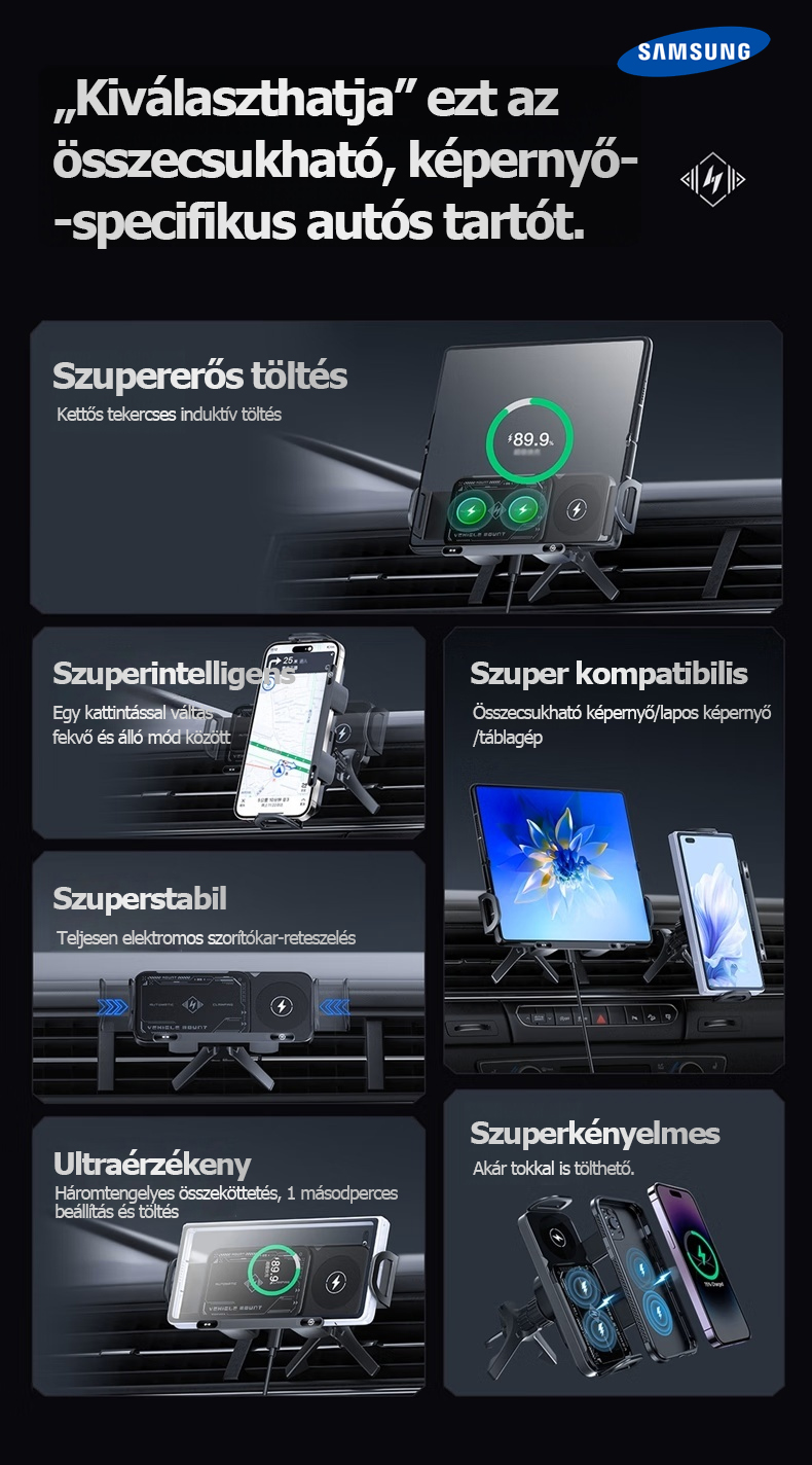 A Samsung hivatalosan bemutatta legújabb 3 az 1-ben automatikusan forgó autós gyorstöltő telefontartóját. Az innovatív kialakítás nemcsak Samsung készülékekkel, hanem számos más márkájú okostelefonnal, összecsukható telefonokkal és tabletekkel is tökéletesen kompatibilis.