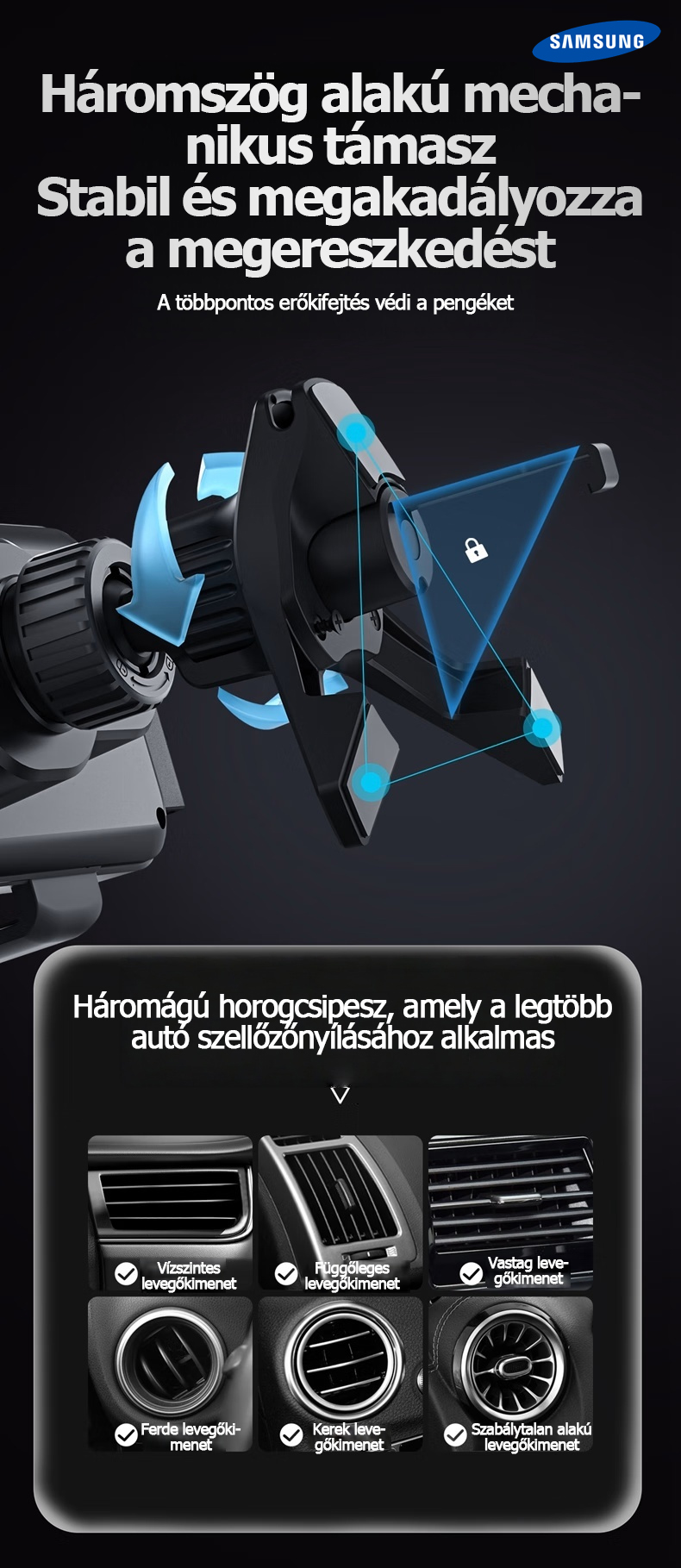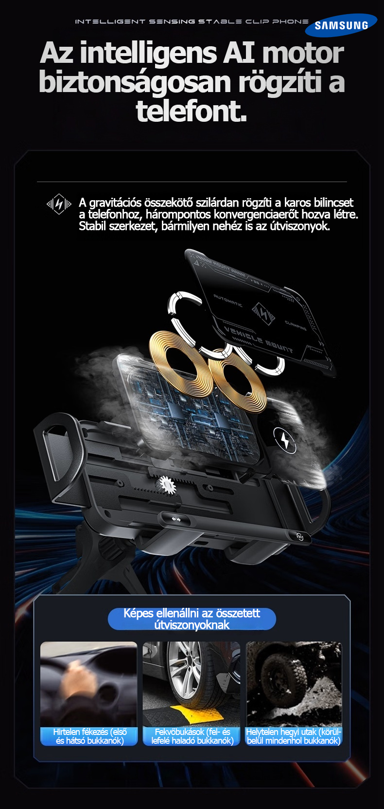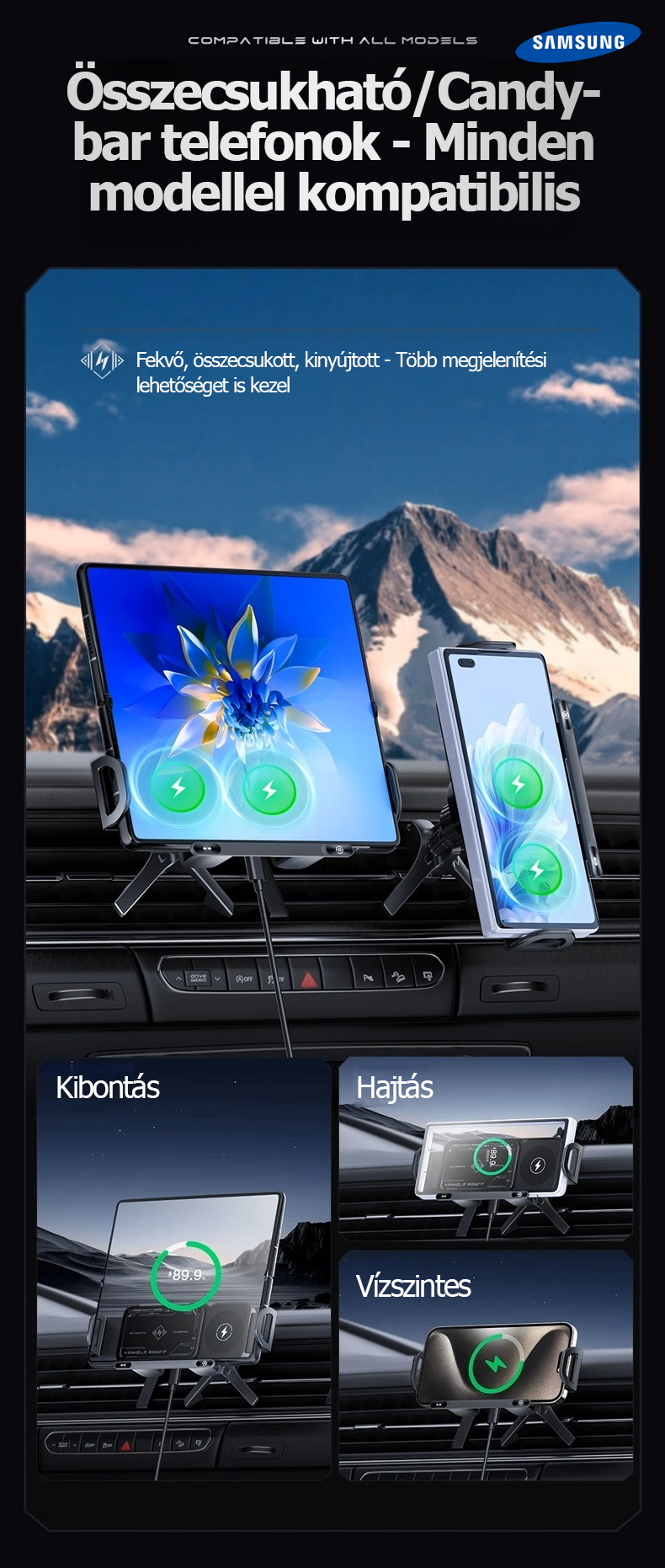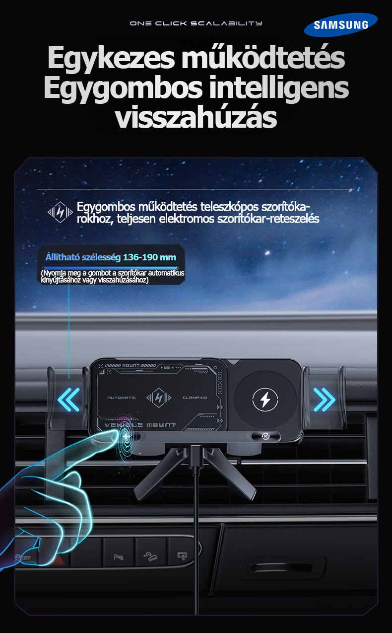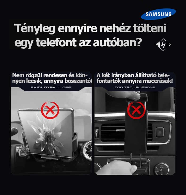 A Samsung hivatalosan bemutatta legújabb 3 az 1-ben automatikusan forgó autós gyorstöltő telefontartóját. Az innovatív kialakítás nemcsak Samsung készülékekkel, hanem számos más márkájú okostelefonnal, összecsukható telefonokkal és tabletekkel is tökéletesen kompatibilis.