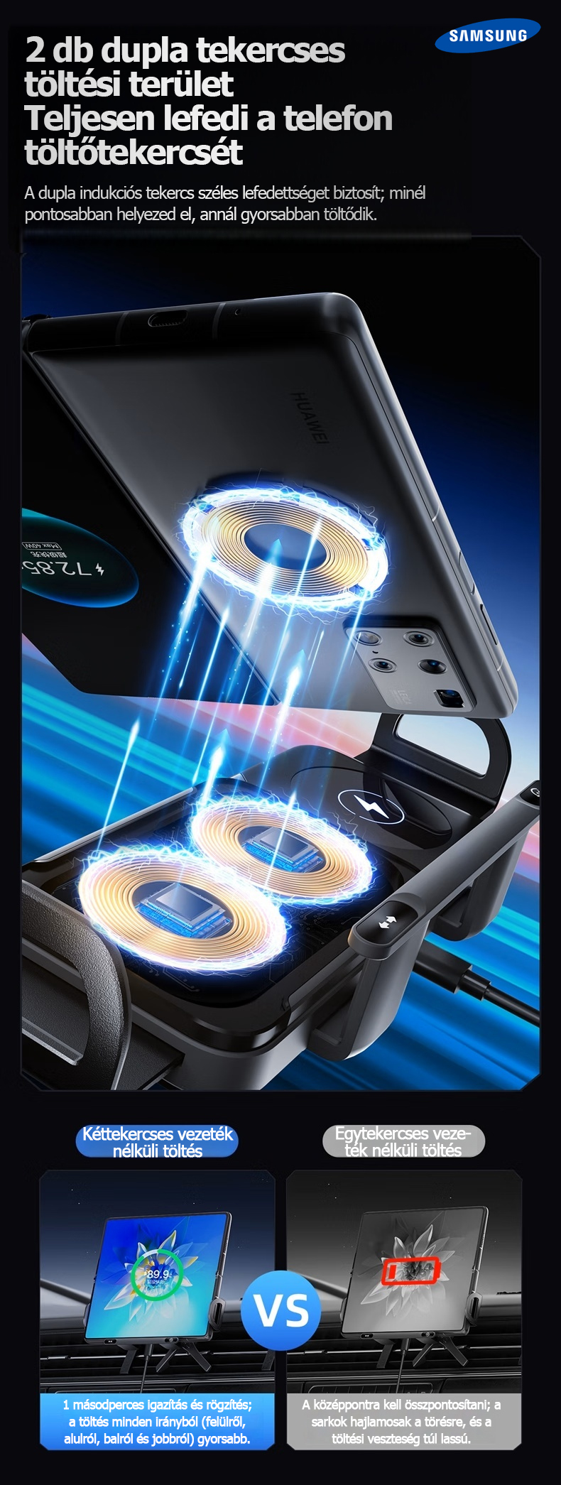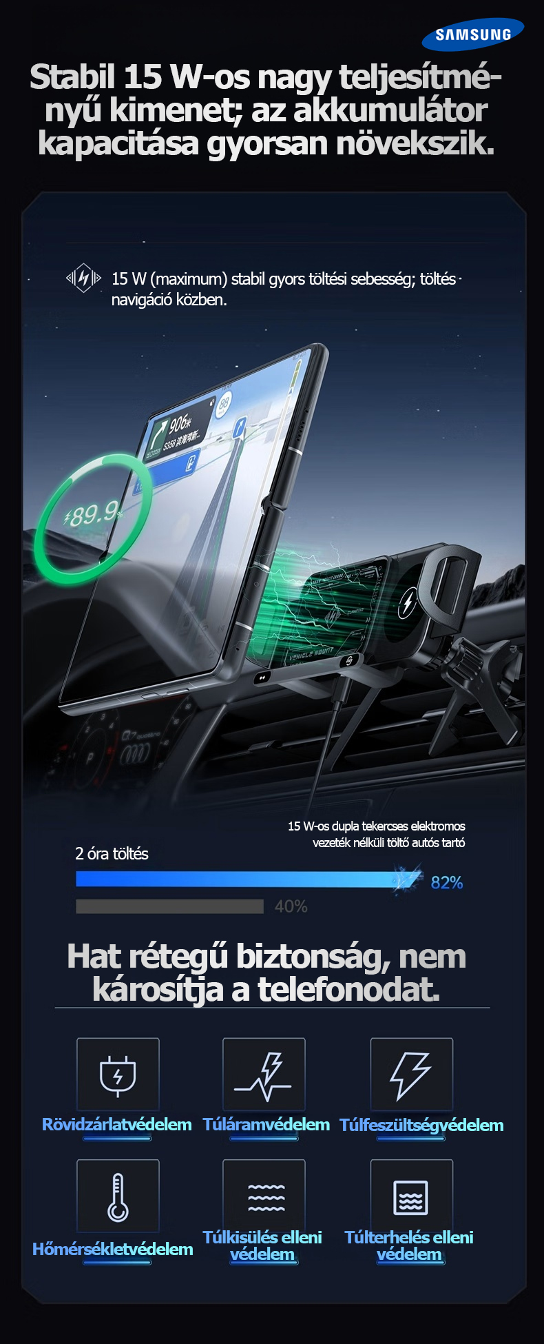 Erőteljes vezeték nélküli töltés, stabil rögzítés és maximális kényelem minden utazás során.